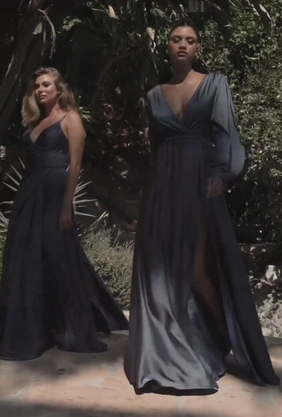 This stunning evening gown is crafted from a soft satin and features romantic split blouson sleeves, a gathered wrap-effect bodice and a deep v-neckline. The gathered A-line skirt features a thigh-high split so you can show a little leg. This dress is the embodiment of elegance, beauty and ease.