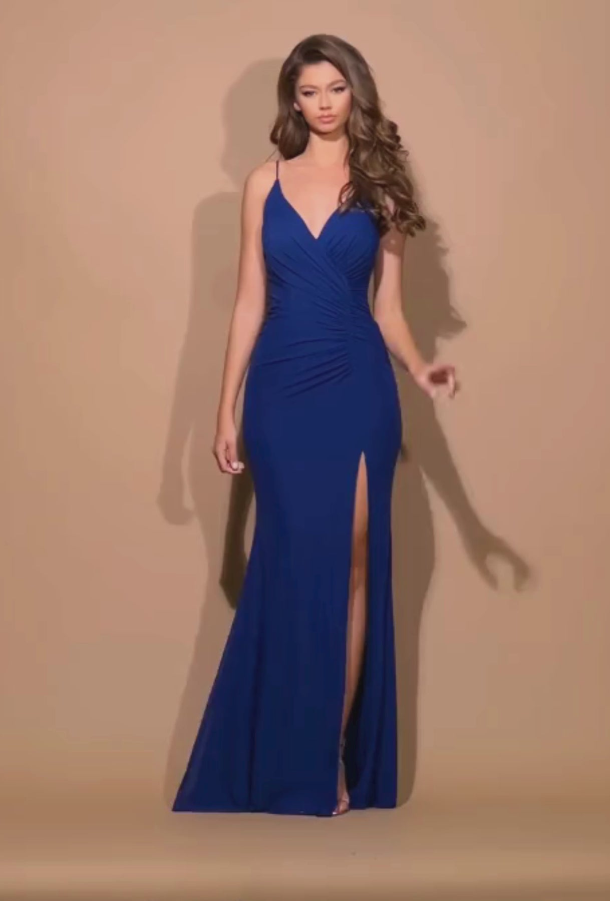 This gorgeous evening gown is crafted out of a stretch lycra mesh and features a boned bodice, rouleaux straps and a thigh high front side split. Ruching at the front and back makes for a flattering fit that brings out of the best of the feminine shape. A small train completes the look.