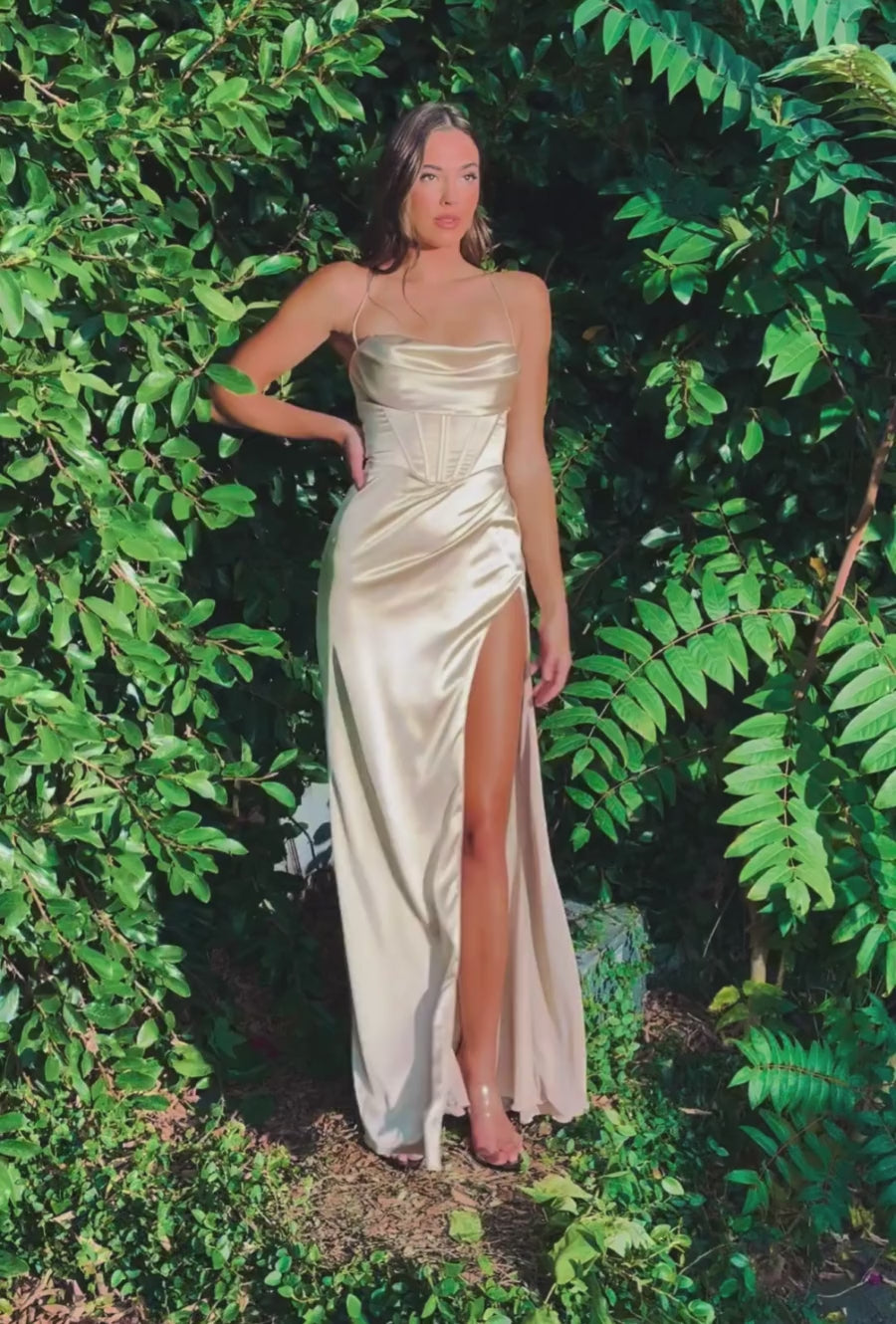 This show stopping evening gown is crafted from satin and features a soft cowl neckline and corset style bodice with exposed boning. The gown also features a lace up back and wrap style skirt with thigh high front side split.