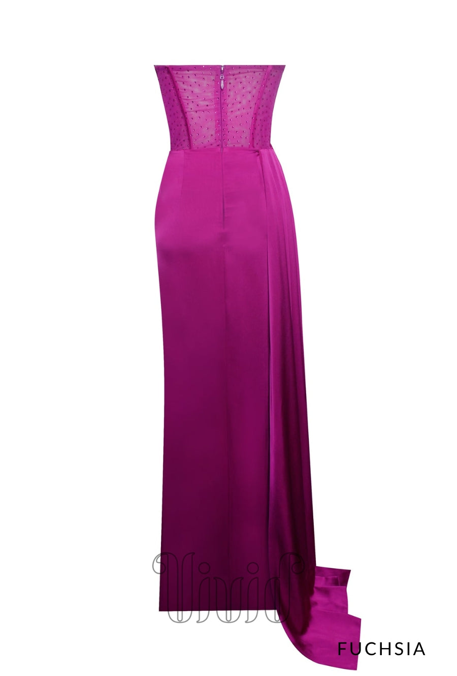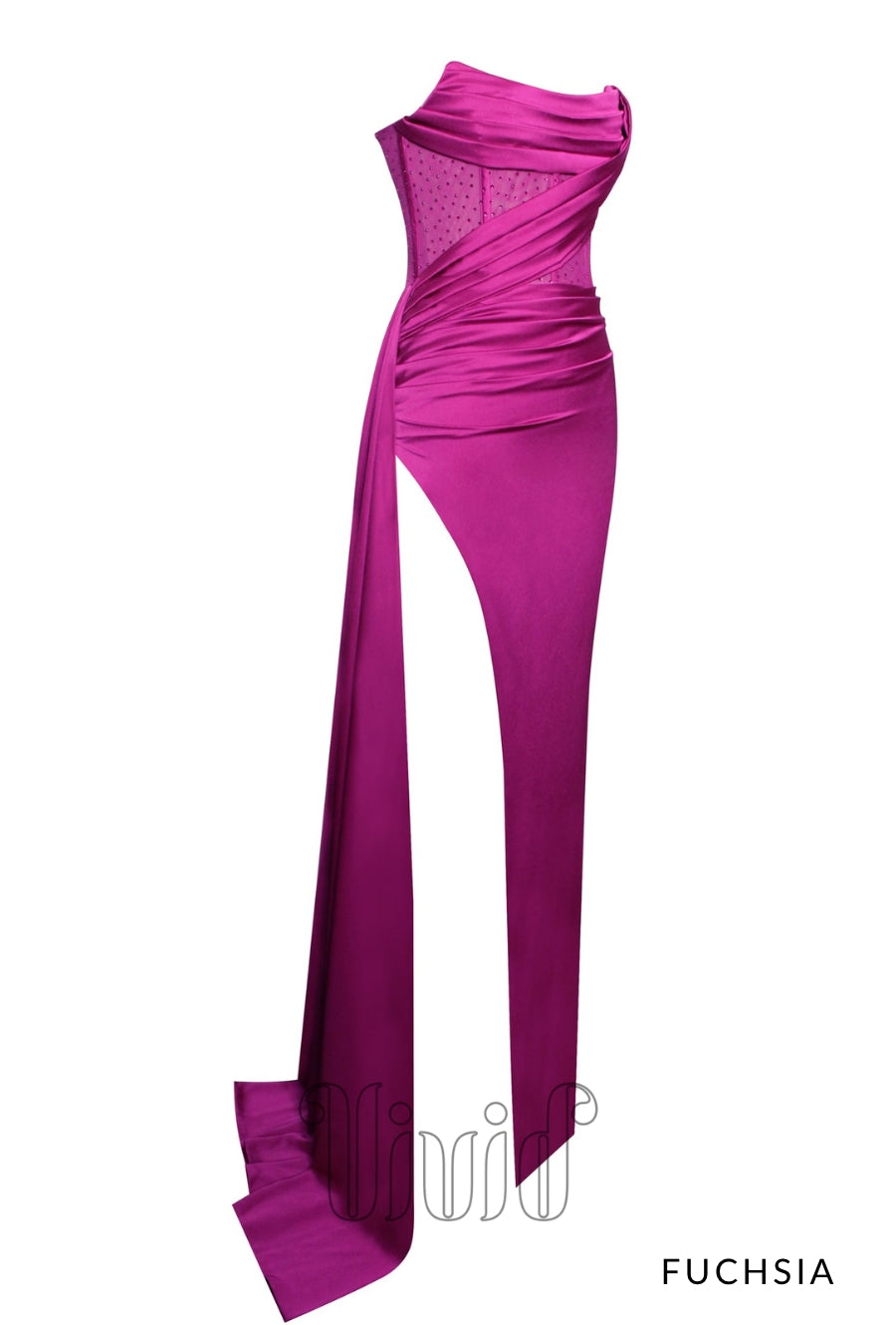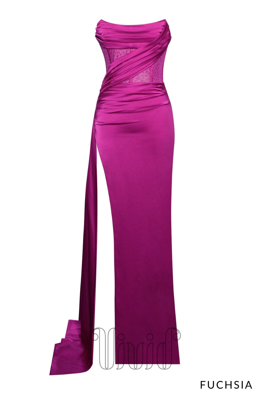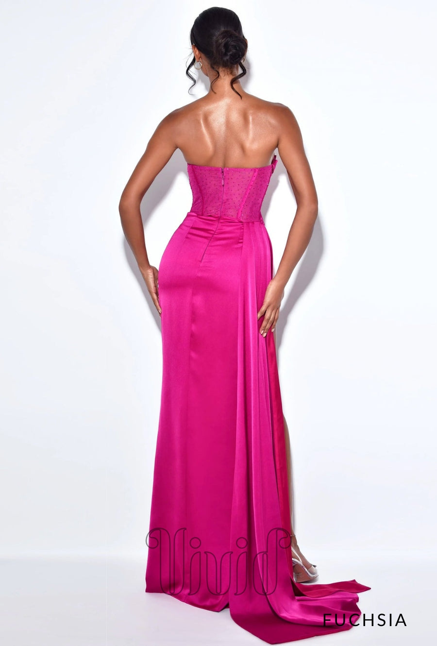Words can not begin to describe this Vivid Formal favorite. This incredible gown is crafted from a rich satin and features a strapless mesh boned corset bodice that flows effortlessly into a draped skirt. This gown was designed for any black tie occasion. The gown also features a thigh high split.