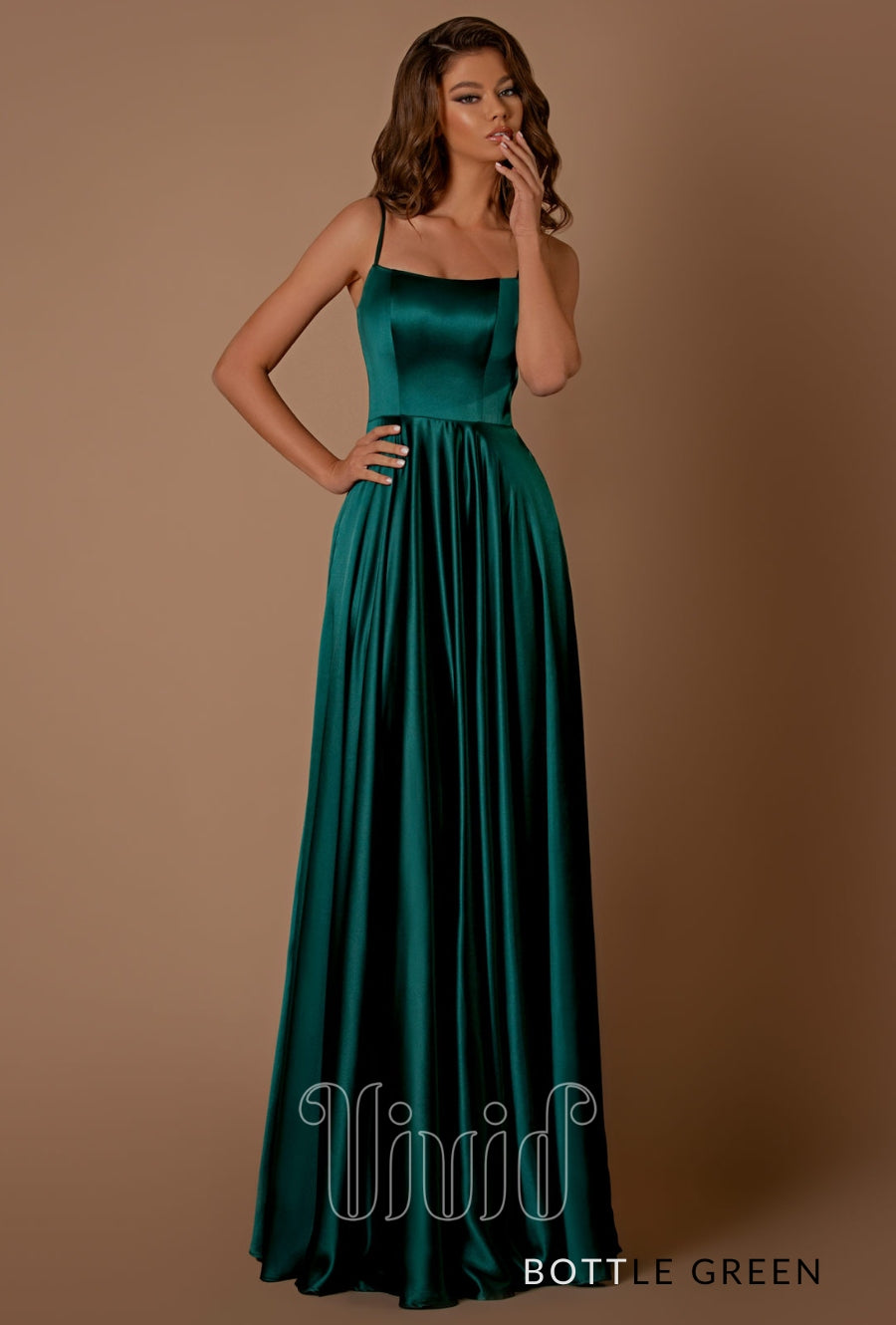 This show stopping evening gown is crafted from a heavy weight satin and features thin straps, lace up back and full skirt.