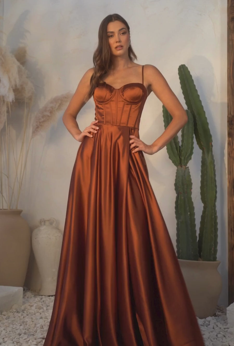 Make a statement in this timeless satin A-line bustier dress. With a classic and elegant feel, this exquisite dress will never go out of style. Its A-line silhouette cascades in a beautiful flow, and the satin fabrication is divinely soft to the touch. The thin straps offer a delicate femininity, and the boned corset bodice provides a stunning and sophisticated look. Add a hint of allure with the sophisticated leg slit. Perfect for a romantic dinner date or a special night out, this divine dress will surely turn heads. Experience exquisite style with this classic and elegant satin A-line bustier dress.