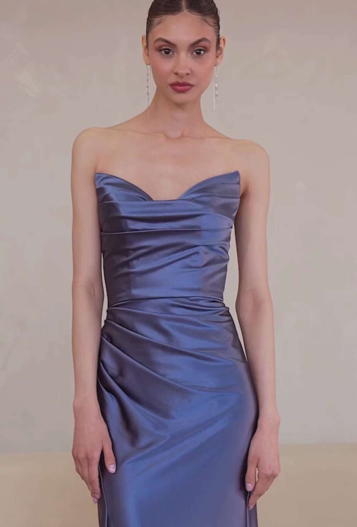 This fitted strapless dress features a flattering V-neckline, with a gathered bodice and hipline that accentuates your natural shape. The soft stretch satin fabric provides comfort, while the leg slit adds a hint of allure. Perfect for attending weddings, as a bridesmaid, or any formal event, this dress ensures you look both elegant and confident.